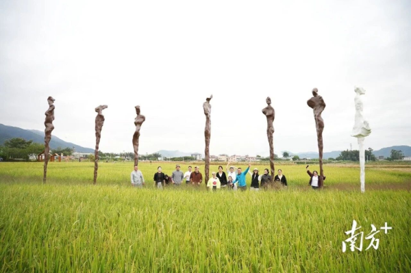 初冬的寿乡稻田,金黄的稻穗随风轻摆。广东(蕉岭)乡建馆旁,黄渤的作品《畴生》静静伫立于稻田间,七座仿佛从泥土中“长出来”的抽象人像与自然景致浑然一体,每一处细节都藏满对乡土的敬畏与思考。