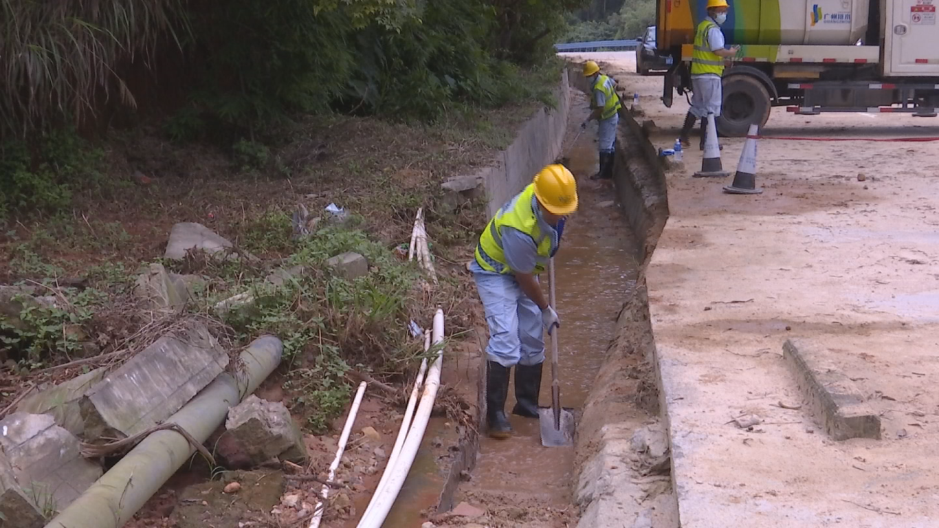 广州水投广州市城市排水有限公司清疏班班长 满锦波:我们22号下午六点钟左右,接到支援蕉岭的通知,第一时间赶赴现场,6月23日早上八点半,我们正式开始对国道边沟进行清疏作业,我们总共派了7个人,两台抓土车,一台工程车赶到这边现场进行作业。暂时我们的清疏进度大概在总工程量的10%左右。下一步,我们会逐步一直往上游进行一个明渠边沟的清疏,抢抓时间尽快恢复边沟的排水。