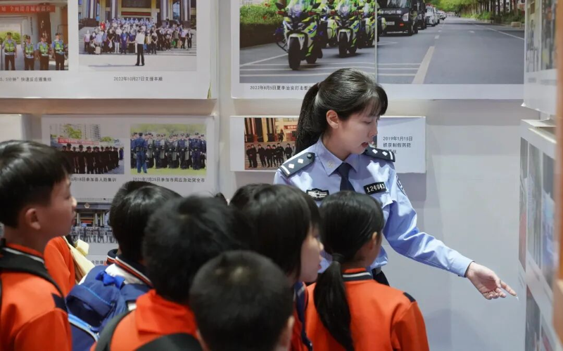 警史室内,一张张老照片、一段段奋斗故事被民警娓娓道来。从打击违法犯罪的果敢出击,到维护社会治安的日夜坚守,从交通秩序的精细管控,到服务群众的暖心瞬间,民警用生动案例还原了蕉岭公安的责任与担当,让孩子们读懂了藏蓝制服背后的使命重量。